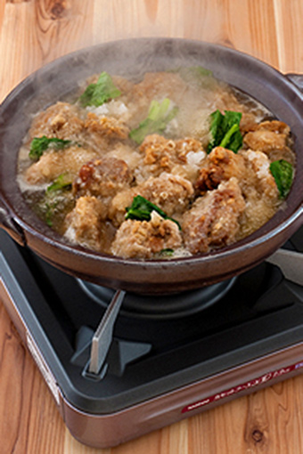 锅中加调料B并煮开,加油炸鸡块和小松菜煮熟。放入萝卜泥迅速加热,连同汤汁盛出来即可。
