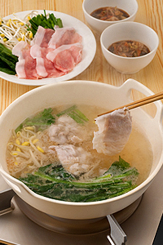 锅内倒芝麻油,小火热锅后将大蒜倒入翻炒。爆香后加水和鸡精煮开。加入芝麻粉,将蔬菜一点点放进锅中煮熟。中途一边撇开浮沫,一边涮肉,蘸取加了泡菜制作而成的调味料味道更加!