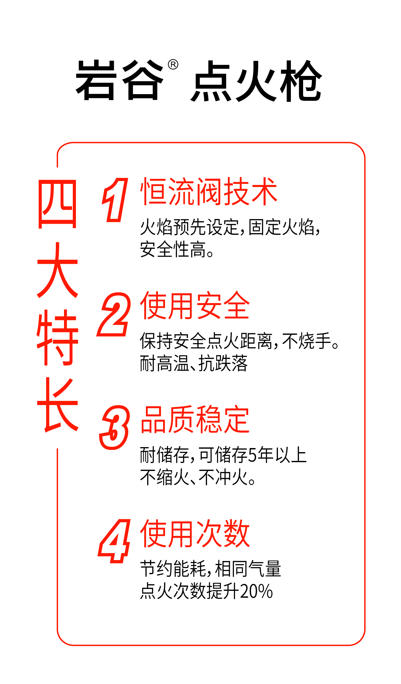 星空体育综合登录入口(中国)官方网站点火枪四大特长 1、恒流阀技术:火焰预先设定,固定火焰,安全性高。 2、使用安全:保持安全点火距离,不烧手;耐高温、抗跌落。 3、品质稳定:耐储存,可储存5年以上;不缩火、不冲火。 4、使用次数:节约能耗,相同气量,点火次数提升20%。